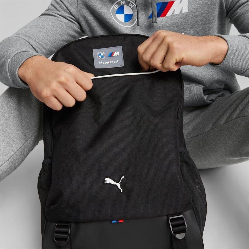 Clean lines, elevated fabrics and a modern silhouette come together for a perfect pairing between BMW M Motorsport and PUMA's athletic history. The backpack features plenty of pockets and the marque's branding to bring to the race track.