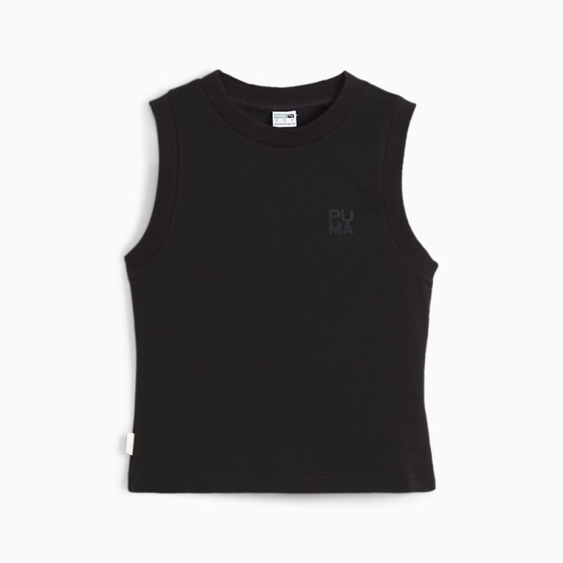 This INFUSE slim tank is a vibe that 100 percent feminine and 100 percent PUMA. The slim-fit tank comes with PUMA's moisture-wicking technology and a the PUMA wordmark on a fun suede puff print.