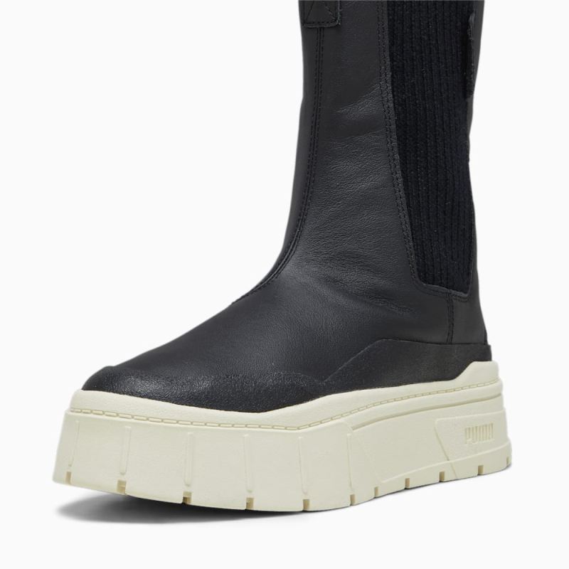 Known for its legacy in the world of sneakers, this season PUMA lends its expertise to crafting the perfect court-inspired Chelsea boots, modelled after our Mayze Stack sneakers. Set on chunky lugged soles for a tough-luxe look, this new Chelsea boot execution features a full leather upper with a cemented die-cut rubber overlay and a knitted, sock-like elastic panel.